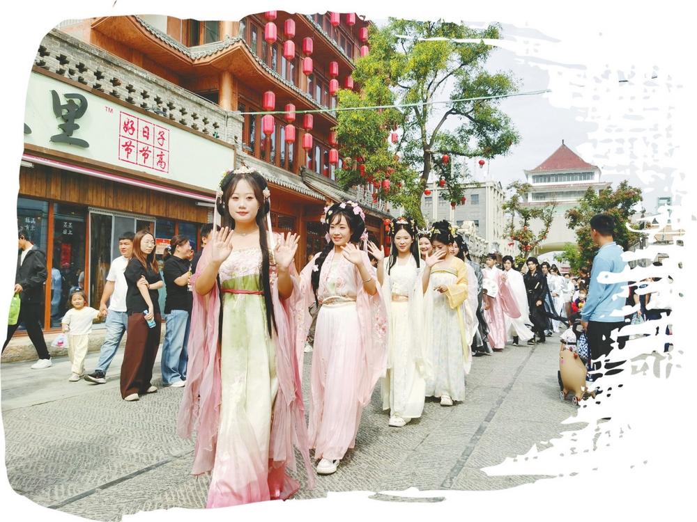 10月1日,身着汉服的演员在好南关街区进行国风快闪巡游,与游客热情互动。