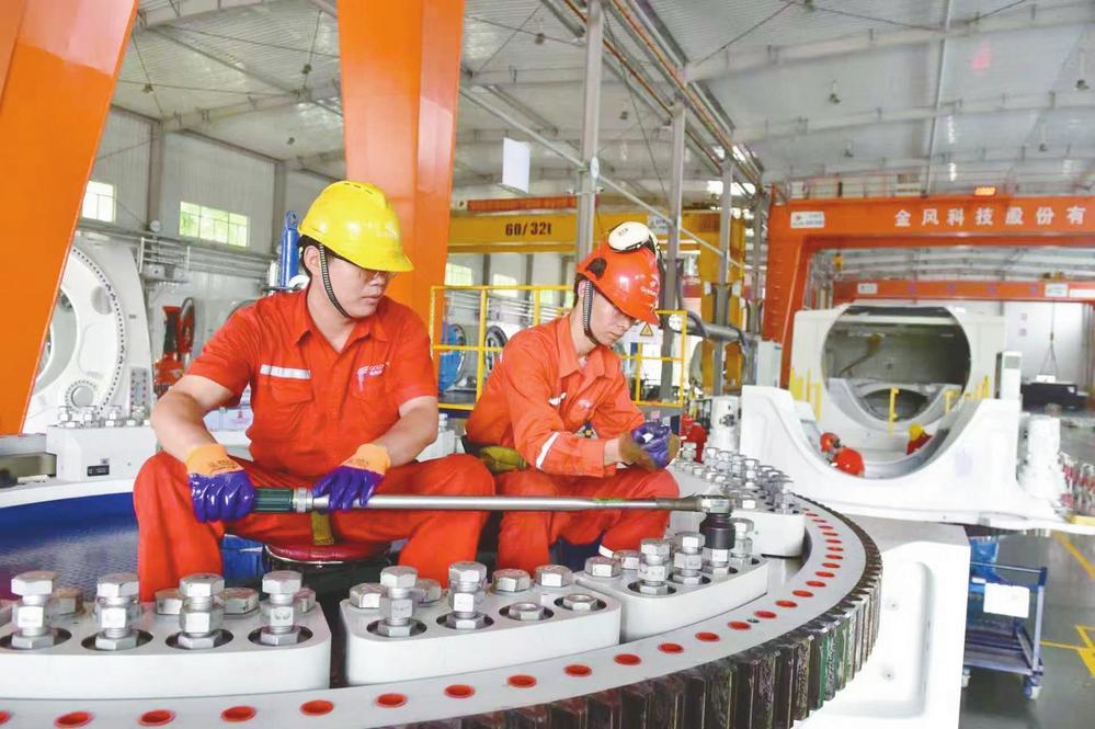 日前,市经开区邢台金风科技有限公司工人正在装配风力发电机叶轮。