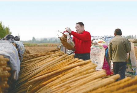 近日,农民在广宗县七斗店村收获麻山药。近年来,广宗县发展特色种植,打造连片种植基地,助力农民增收。