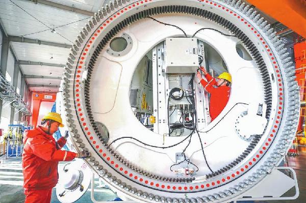 图为近日邢台金风科技有限公司工人正在装配叶轮。