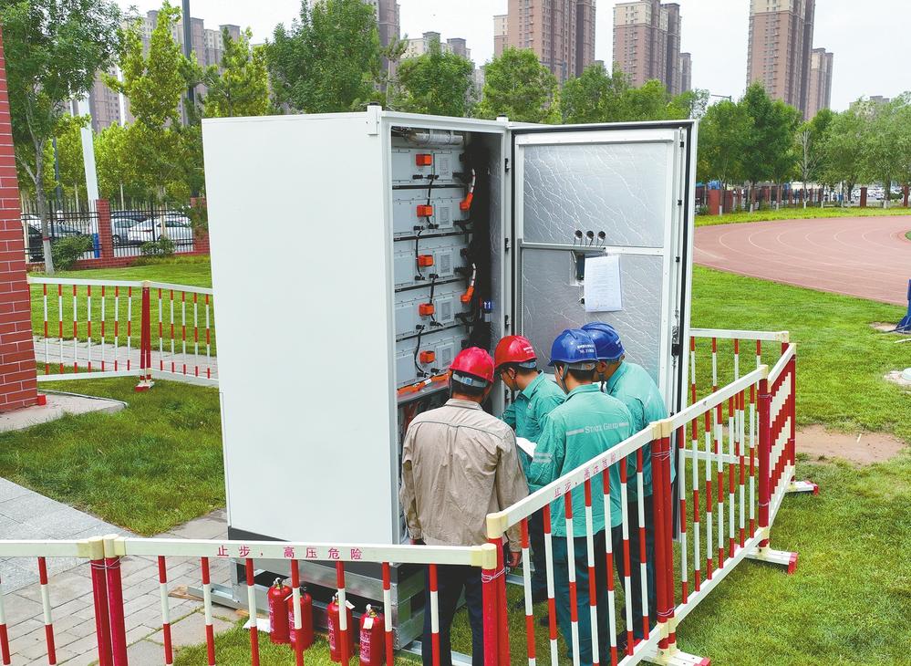 6月5日,国网邢台供电公司员工在市第一中学新校区高考考点,检查应急用电系统储能电池状态和室内用电设施,确保高考期间电力供应稳定可靠。 韩文洲、甄红芳摄