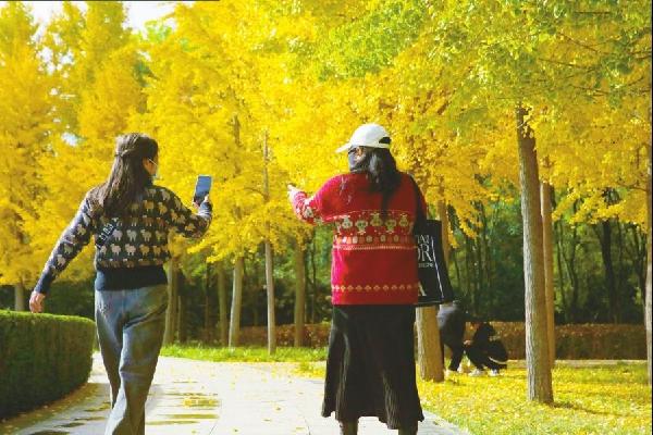 近日,游客们一走进达活泉公园北门,便会被满目“银杏黄”所吸引。秋风吹过,落叶纷纷扬扬,吸引了众多游客打卡拍照。