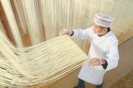 南宫市有着悠久的手工挂面加工历史,2023年南宫手工挂面制作技艺被评为邢台市市级非物质文化遗产项目。近年来,南宫市大力推进手工挂面产业发展,通过“线上 线下”模式,将手工挂面传统特色产业推向专业化、规模化发展,拓宽了群众致富路。本报记者 韩文洲 通讯员王林摄