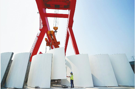 近日,在市经开区邢台中萨新材料科技有限公司,安检员正在检查风电塔筒质量。