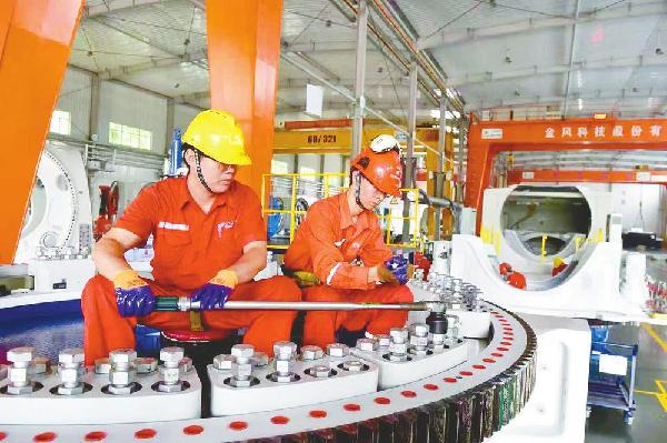 日前,市经开区邢台金风科技有限公司工人正在装配风力发电机叶轮。