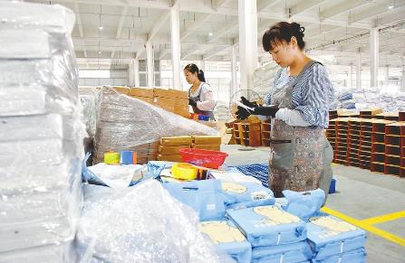 日前,在南和区贾宋镇一家电商企业,工人在打包快递。