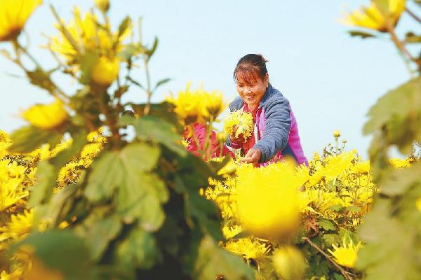 日前,内丘县吴村村民正在采摘金丝黄菊。