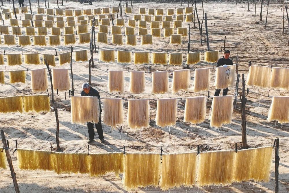 近日,在信都区南大郭镇南高村粉条加工厂,工人正在晾晒粉条。该村以“合作社 农户”模式,利用冬季农闲加工粉条,今年预计加工12万斤,产值150万元,助力村民增收。