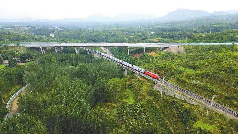 9月16日下午,“抗大号”铁路客运列车试运行。图为列车经过风景秀丽的皇寺镇。 本报记者 韩文洲、张驰摄