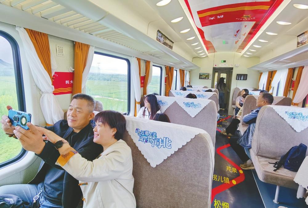 九月十九日,游客在河北首条红色旅游专列——“抗大号”铁路客运列车上拍照,欣赏太行山的绝美风景。 本报记者 黄涛摄